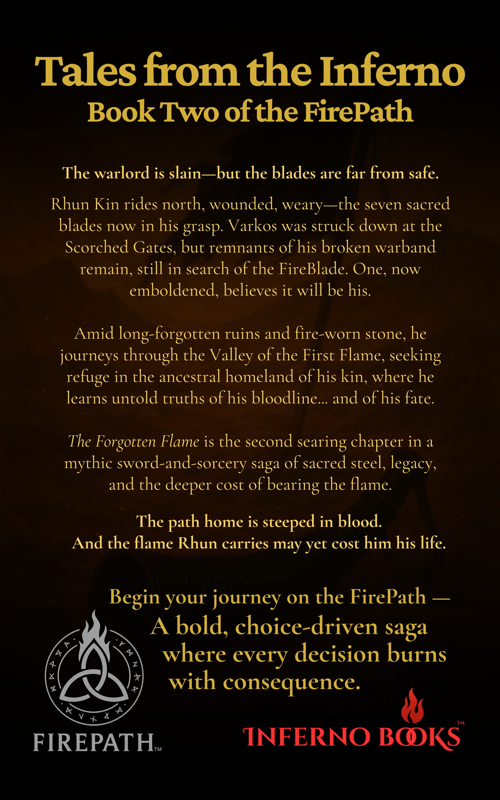 After the battle at the Scorched Gates, Rhun Kin escapes the erupting valley with all seven sacred blades reclaimed. The tyrant Varkos lies dead, yet the lands remain unstable. Fractured remnants of his warband still roam the scorched plains, their leaders driven by vengeance and ambition. One among them now believes the FireBlade belongs to him.